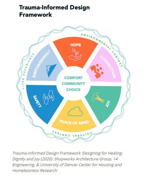 Due to the difficulties already experienced by these youth, care should be taken in the design to address this (trauma informed design). Trauma-informed principles can be applied to building design to promote better outcomes for the people who live and work in affordable and transitional housing.